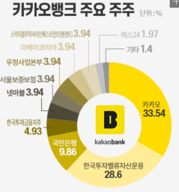 카카오뱅크의 지분 구조를 보면 가장 1대주주인 카카오를 비롯하여 한국투자벨류자산운용, 국민은행,한국투자금융지주,넷마블,서울보증보험,우정사업본부,이베이코리아,스카이블루럭셔리인베스트먼트,예스24등으로 여러 회사가 카카오뱅크의 지분을 보유하고있는것을 볼 수 있습니다.