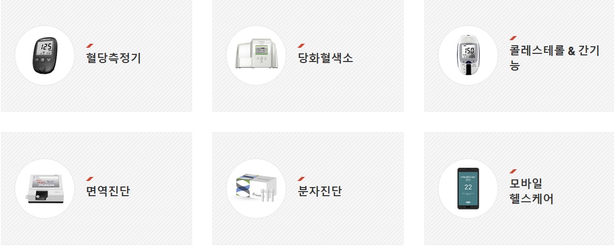 혈당 측정기, 당화 혈색소, 콜레스테롤 &간기능, 면역진단, 분자진단, 모바일헬스케어 등에 분야에서 제품군을 개발하고 있으며 , 생화학진단, 면역진단, 분자진단 등의 분야에 연구개발을 진행하고 있습니다.